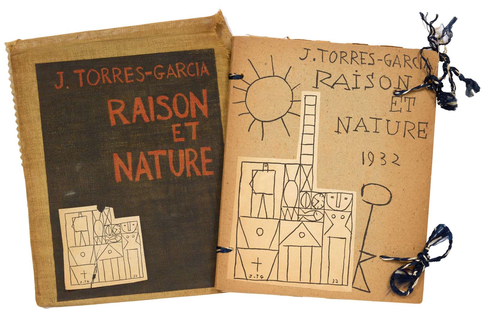Raison et Nature. Théorie. (Paris), Editions Iman, 1932. In-4, en feuilles. 45 ff., imprimés au recto, sous chemise fine à rabats, le tout dans un emboîtage cartonné à cordons de soie bleue et blanche au premier plat imprimé du motif contrecollé sur l’étui. Le tout placé dans un étui de toile de jute brute sérigraphiée en noir et rouge (titre) avec un dessin de l’ouvrage, signé et daté, imprimé sur papier aux contours du motif, contrecollé. Édition originale. Ouvrage photogravé, dessins au trait et texte autographié en noir. Livre d'artiste reproduisant le texte et les dessins de l’auteur, Joaquin Torres-Garcia (1874-1949), artiste hispano-uruguayen lié aux Cubistes et Surréalistes. Publié deux ans après son initiative constructiviste Cercle et Carré (1929-1930), ce titre se présente comme le manifeste d'un artiste montant, il expose chez Jeanne Bucher en 1931 ou à la galerie Percier ; chez Georges Petit en compagnie de Giacometti, Dali, Ernst ou Miró ; en 1932 chez Pierre Loeb… Ce sera son dernier livre avant son retour à Montevideo. Unique ouvrage publié par les éditions Iman, de la revue du même nom, fondée par la poétesse argentine Elvira de Alvear, muse de Borges. Légère oxydation homogène des feuillets, comme on le voit souvent sur des papiers de cette époque, la chemise interne à rabats a cédé au niveau des pliures, la cheminée du dessin contrecollé sur l’étui est manquante, qques brins effilochés au bord de la chemise mais bon exemplaire.