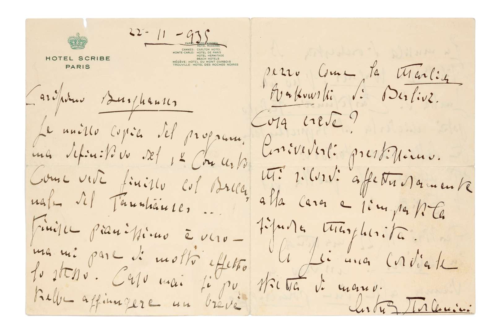 L.A.S. « Arturo Toscanini », Paris 22 novembre 1935, à Ugo BURGHAUSER des Wiener Philarmoniker à Vienne ; 3 pages in-8 à en-tête de l’Hôtel Scribe, enveloppe timbrée ; en italien.