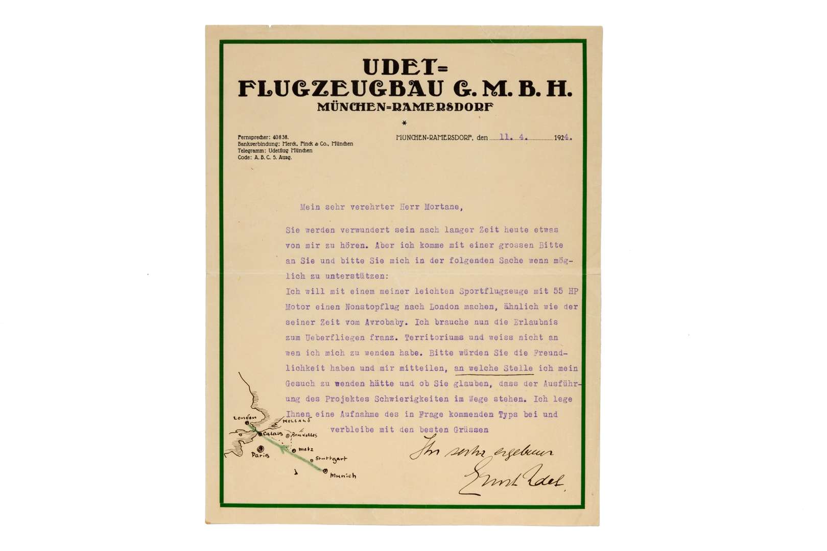 L.S. « Ernst Udet » avec CROQUIS autographe, München-Ramersdorf 11 avril 1924, à Jacques MORTANE ; 1 page in-4 à en-tête Udet-Flugzeugbau G.M.B.H. ; en allemand.