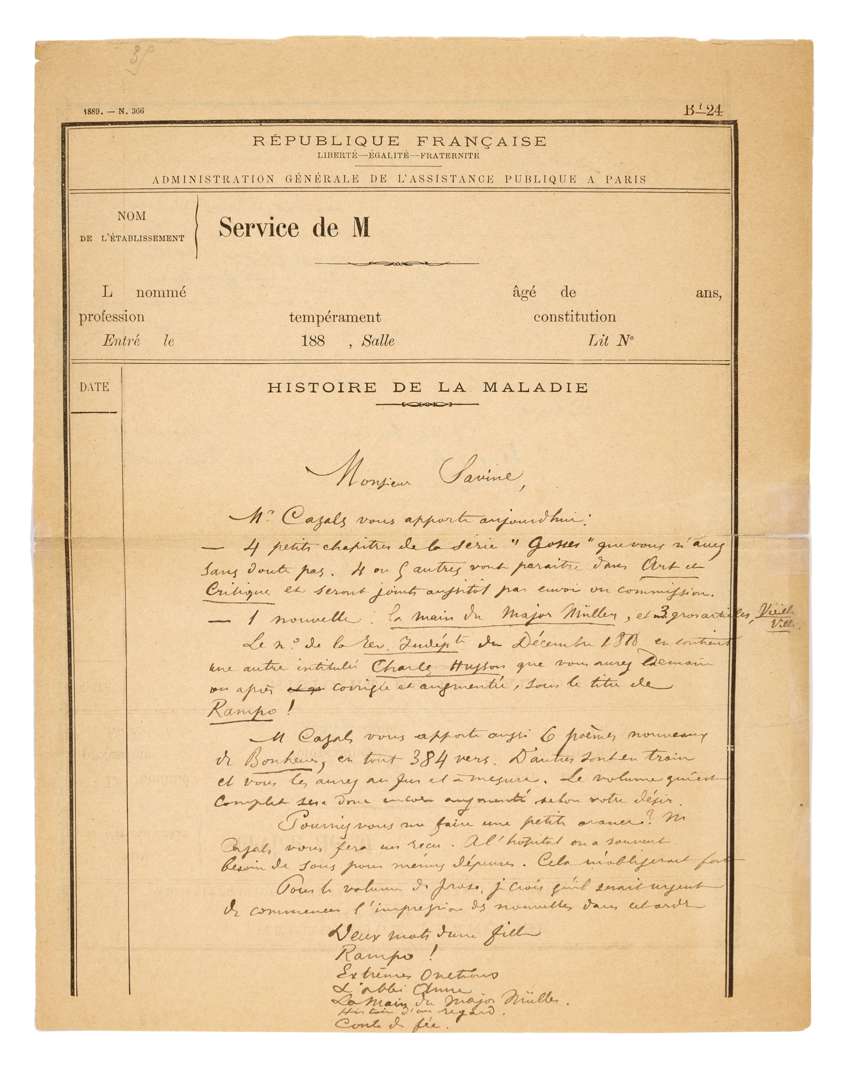 L.A.S. « Paul Verlaine », Hôpital Broussais, salle Lasègue [janvier ou début février 1890], à l’éditeur Albert SAVINE ; 2 pages in-4 sur papier de l’Administration générale de l’Assistance publique à Paris (fente au pli réparée).