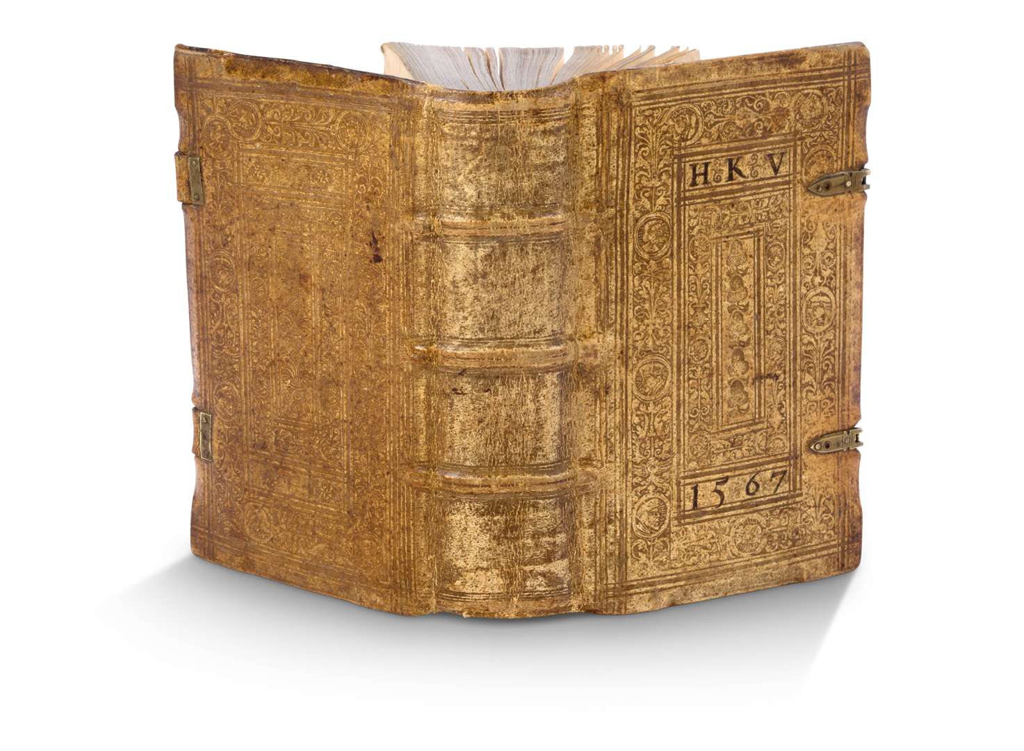 P. Virgilii Maronis Opera: D. Philippi Melanchthonis Scholijs illustrata: Accesserunt & Christophori Hegendorphini in Georgica, & in omina Virgilij opera ex Stephani Doleti de Lingua Commentariis Annotatiunculae, quae uicom protixi Commentarij supplere possunt ; Item Rerum & verborum Index Francofurti (Francfort-sur-le-Main), Per Davidem Zephelium (David Zöpfel), 5 aout 1559. In-4 au format petit in-12. (6)-766 pp., 16 ff. d’index et colophon, 18 gravures in-texte. Petite édition latine en lettres rondes. Colophon : Francofurti, per Da-videm Zephelium, Anno Salutis hu-mane M.D.LIX. mense Augusto. Avec 18 bois gravés en noir, certains avec une mise en coloris monochrome et succinte de l’époque de type “allemand”, dont le titre orné d’une grande marque typographique à la sphère et aux 3 figures (discrète mise en coloris monochrome de la même époque). Petites lettrines gravées, au crible ou à figures. Vélin teinté et estampé de l’époque, reliure très probablement allemande avec supra libros “H K V” et date 1567 estampés en noir au premier plat, dos à 3 nerfs compartimenté à froid, plats estampés avec encadrements de motifs floraux alternés de profils des grands humanistes en vignettes et de triple filets, motif central avec 5 glands estampés, fermoirs métalliques. Édition illustrée du XVIe siècle particulièrement rare, dans son vélin estampé de l’époque. Très joli cycle iconographique de Virgile illustré d’une des toutes premières éditions latines ornées. Aucun exemplaire au CCFr et une seule entrée au WorldCat. Édition humaniste des œuvres complètes de Virgile, commentées par Philipp Melanchthon (1497-1560) - humaniste, professeur à l’université de Wittenberg, qui adhère tôt à la Réforme devenant ami et premier collaborateur de Luther - et préparées par Christoph Hegendorph (1500-1540). Ce type de publication témoigne de la volonté protestante d’utiliser les textes d’auteurs antiques enrichis de commentaires moraux et pédagogiques afin de diffuser leurs idées, les remarquables illustrations vivantes participant à l’attrait de la publication. Notre titre est orné de bois gravés par Virgil Solis (1514-1562), célèbre dessinateur et graveur allemand de Nuremberg, qui orne nombre d’ouvrages classiques et bibliques à cette période. Ses compositions fouillées, vives et narratives, bien exécutées, donnèrent un souffle nouveau à l’iconographie virgilienne et furent largement diffusées dans l’Europe réformée. Graesse, Trésor de livres rares et précieux, VIII, 403. Brunet, V, 1305. Ex libris à la plume de l’époque dont “Joannes…”, non identifiés, daté 1561, sur la première garde. De discrètes usures et salissures sur l’ensemble de l’ouvrage. Velin qque peu noirci. Qques traces latérales de mouillures et petits défauts d’oxydation aux feuillets mais bon exemplaire dans l’ensemble. Un fermoir manquant.