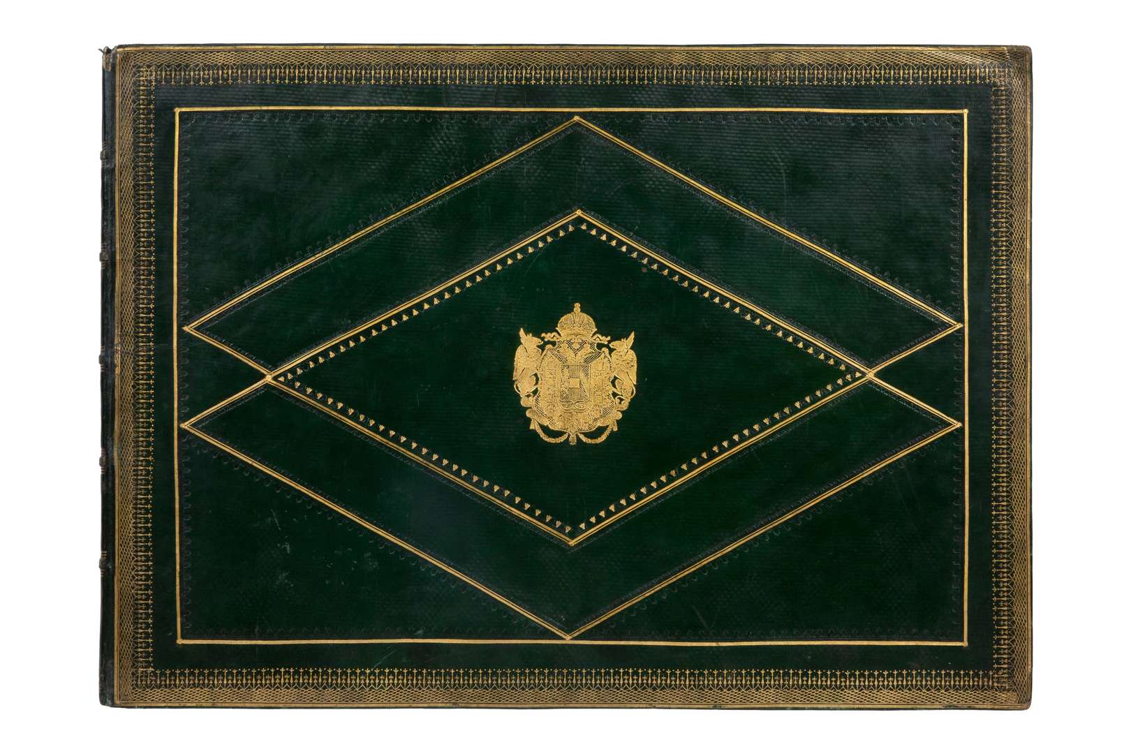 Illustratione dell’Arco della Pace in Milano. […] Dedicato a Sua Eccellenza il Sig. Conte Francesco di Hartig, Governatore della Lombardia. Milano, Architetto Ingegnere Voghera, 1838. Grand in-folio oblong. Maroquin vert impérial de l’époque, large guirlande dorée encadré d’un filet doré et d’une roulette dorés de même, motif géométrique à double losange doré souligné de roulettes à froid et d’une roulette dorée le tout encadré d’un filet doré, grandes armes dorées de Ferdinand Ier au centre, dentelle dorée aux contreplats. Titre entièrement gravé, (1) p. de dédicace, 4 pp. de texte et 28 planches lithographiées en noir. Première édition de cet album, dans un beau maroquin italien aux armes de Ferdinand Ier, Empereur d’Autriche, Roi de Lombardie Vénétie. Ferdinand Ier (1793-1875) est couronné empereur d’Autriche l’année de l'inauguration de l'Arco della Pace et de la publication de l’ouvrage, en 1838. Magnifique ouvrage décrivant l’édifice à Milan, Ce grand arc néo-classique, en bois à l’origine, fut édifié par l’architecte italien Luigi Cagnola pour honorer Eugène de Beauharnais en 1807 : Napoléon venait de l’investir prince de Venise, le déclarer son fils adoptif et héritier présomptif de la couronne d’Italie, alors même que naissait son premier enfant avec Augusta-Amélie de Bavière. Inachevée à la chute de l’Empire, sa construction reprend sous François I d’Autriche qui dédie l’arc à la Paix des grandes puissances européennes en 1815. L’ouvrage sera achevé en 1838, terminé par les architectes Francesco Londonio et Francesco Peverelli en 1833. Très belles vues dont une perspective en clair-obscur, des coupes transversales et bas-reliefs, des détails architecturaux et sculpturaux… Légers frottements au dos et coins, coiffe supérieure accidentée, marque de pliure aux planches, très légères rousseurs, une charnière fendue sur 1cm mais bon exemplaire.