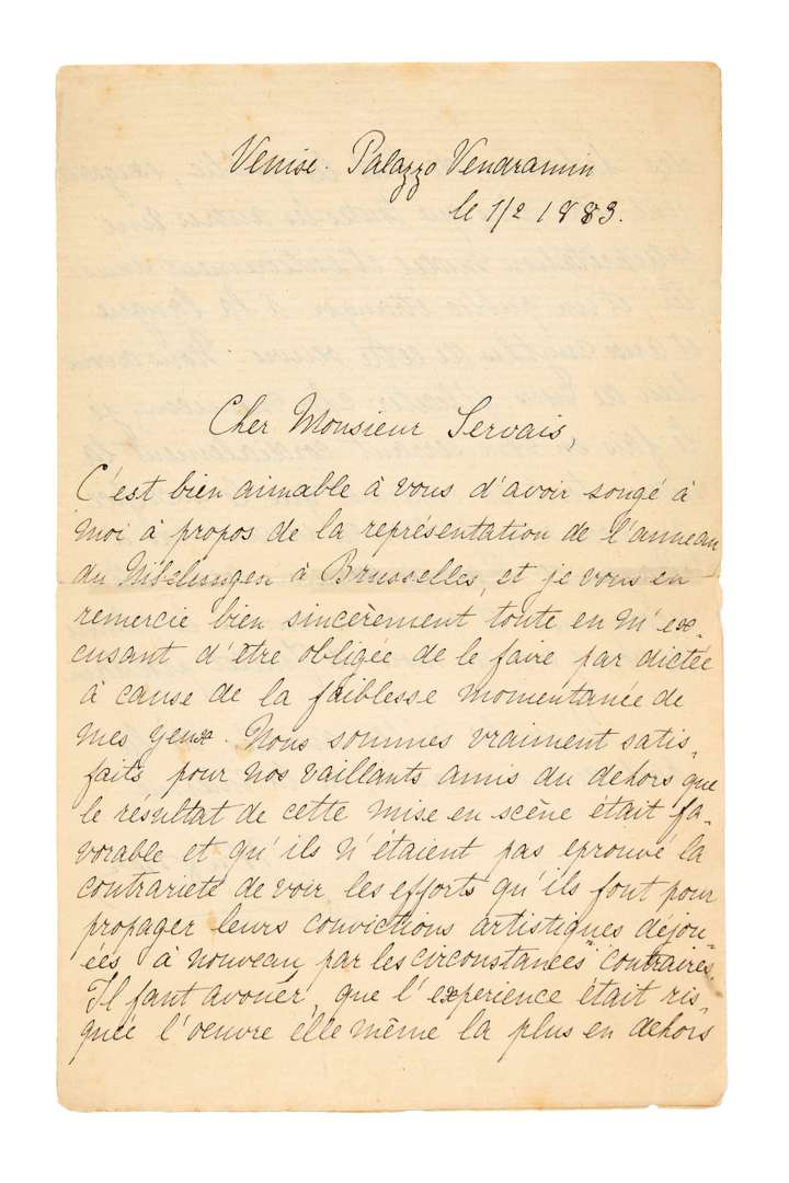 L.S. « C. Wagner », Venise, Palazzo Vendramin 1er février 1883, à Franz SERVAIS ; 2 pages in-8 (fente au pli réparée) ; en français.