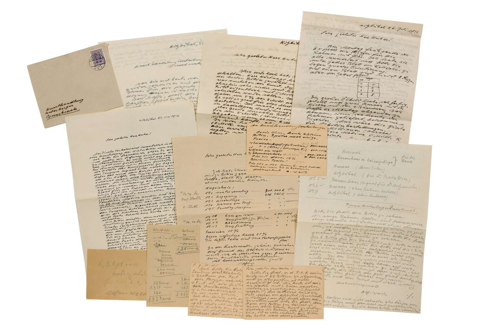 11 L.A.S. « A. Walde » ou « Alfons Walde ». Kitzbühel, 1924-1925, à M. HUBER de la galerie d’art UNTERBERGER à Innsbruck ; 15 pages formats divers, dont 4 Postkarte avec adresses, 6 enveloppes ; en allemand (transcription jointe).