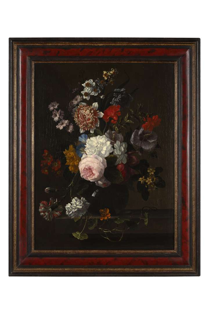 Nature morte aux roses blanches, violettes, aster de Chine, anémones blanches et violettes, coquelicots, ancolies et autres fleurs ;