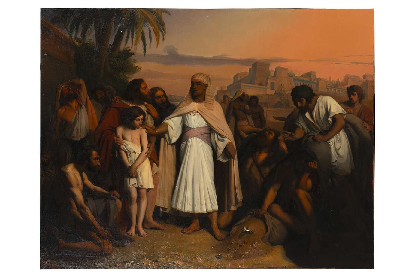 Elève de Picot, c’est la deuxième fois que Brisset tente le Grand Prix, fort de sa deuxième place au concours de 1837. Il a retenu la leçon de son maître dont l’enseignement est fondamentalement basé sur le dessin. Morceau de bravoure pour les jeunes peintres, l’épreuve est aussi une occasion de prouver sa maîtrise de l’anatomie et de l’expression des passions, comme c’est ici le cas, les visages exprimant toute une palette d’émotions en lien avec le sujet : désespoir, tourmente, crainte, culpabilité, autorité. La scène prend place dans une Egypte que le peintre n’est encore jamais allé voir mais qui évoque le goût d’une époque pour un Orient rêvé.