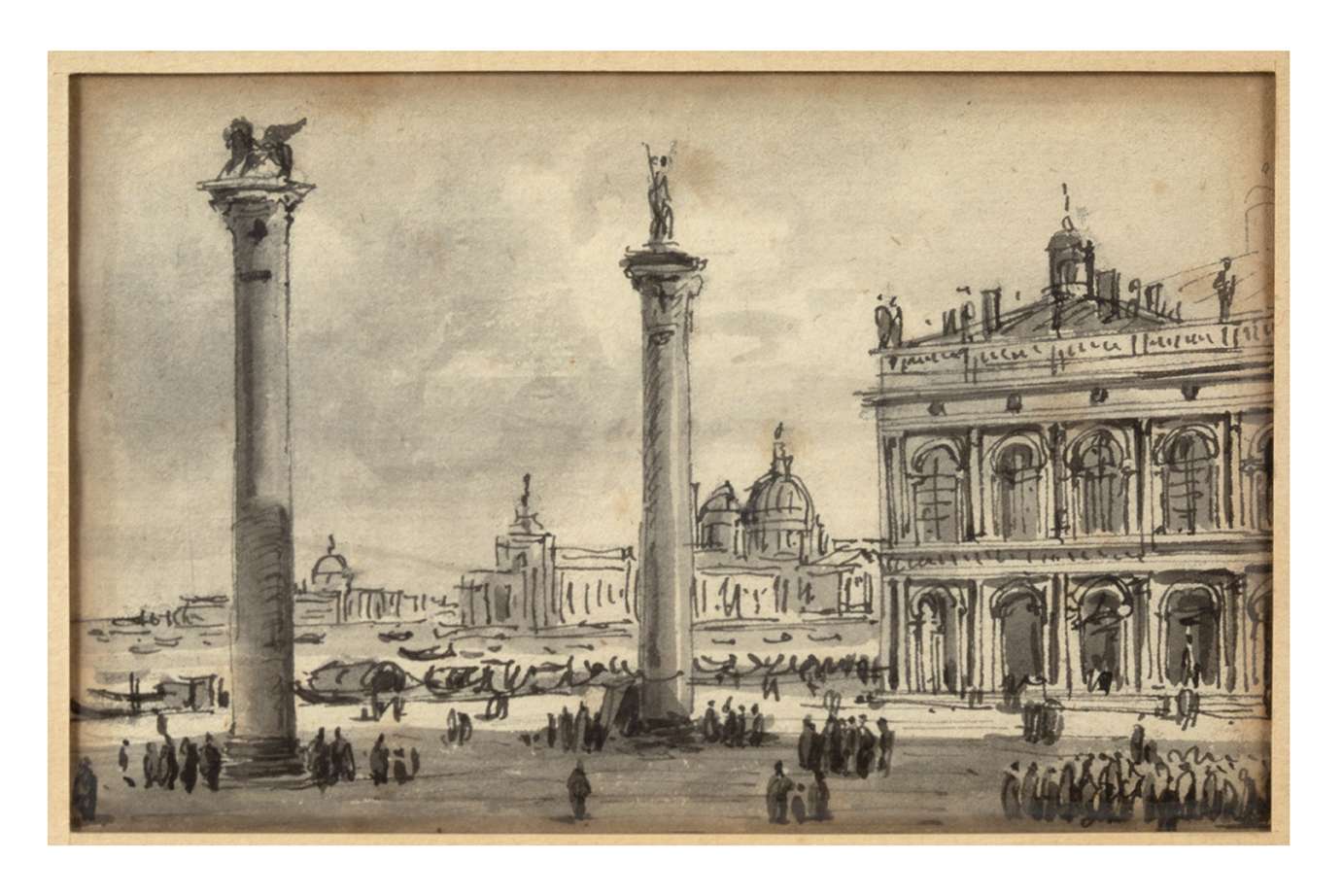Ce riche fonds que nous présentons permet un aperçu des méthodes de l’artiste. Nicolle griffonne. Il griffonne des suites de figures aux attitudes diverses et multipliées, la façade d’une maison, la vue qu’il a d’un hameau à son approche, la prière intime d’une paysanne. Lorsqu’il colore, sa palette aquarellée, toujours douce, laisse planer sur l’ensemble une atmosphère où il fait bon vivre. C’est au fil de ses pérégrinations italiennes que nous suivons l’artiste, une Italie sur laquelle il pose un regard intimiste. Attiré sans doute par une forme de nostalgie, un goût certain pour les ruines, Nicolle vagabonde entre Rome, Florence, Venise et les campagnes qui les séparent. Dessinateur prolixe, il décline dans ses croquis le panorama d’un pays où se mêlent la vie quotidienne de ses habitants les plus modestes, celle de ses visiteurs d’un jour et des monuments millénaires dans les vestiges desquels il se perd. Disséminant ses figures parmi des études architecturales minutieuses, il renforce ainsi l’atmosphère pittoresque qui relie les dessins de son corpus.