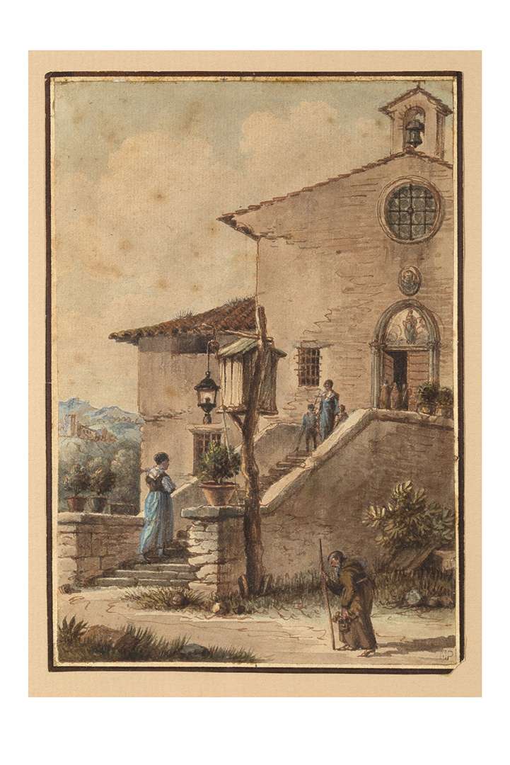 Ce riche fonds que nous présentons permet un aperçu des méthodes de l’artiste. Nicolle griffonne. Il griffonne des suites de figures aux attitudes diverses et multipliées, la façade d’une maison, la vue qu’il a d’un hameau à son approche, la prière intime d’une paysanne. Lorsqu’il colore, sa palette aquarellée, toujours douce, laisse planer sur l’ensemble une atmosphère où il fait bon vivre. C’est au fil de ses pérégrinations italiennes que nous suivons l’artiste, une Italie sur laquelle il pose un regard intimiste. Attiré sans doute par une forme de nostalgie, un goût certain pour les ruines, Nicolle vagabonde entre Rome, Florence, Venise et les campagnes qui les séparent. Dessinateur prolixe, il décline dans ses croquis le panorama d’un pays où se mêlent la vie quotidienne de ses habitants les plus modestes, celle de ses visiteurs d’un jour et des monuments millénaires dans les vestiges desquels il se perd. Disséminant ses figures parmi des études architecturales minutieuses, il renforce ainsi l’atmosphère pittoresque qui relie les dessins de son corpus.