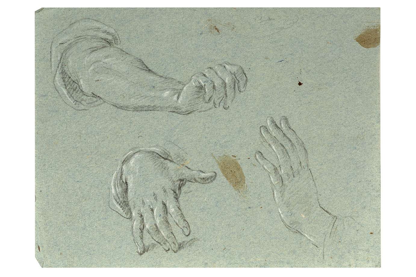 Study sheet with three hands, black pencil highlighted with white chalk on blue paper