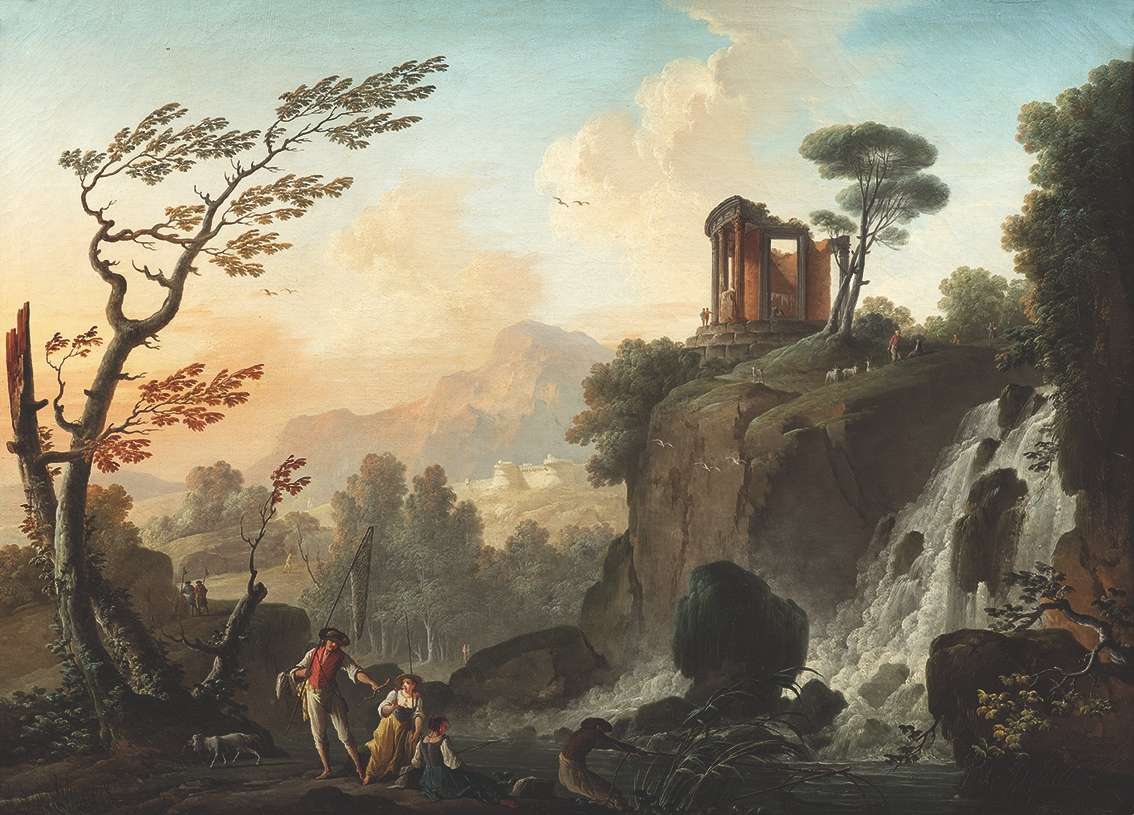 Topos pour tous les artistes ayant séjourné à Rome, la cascade de Tivoli est un motif qui a fasciné les artistes au fil du temps. Incontournable pour celui qui se sera égaré bien commodément aux abords de la Ville Eternelle, il est par ailleurs souvent accompagné du temple de Sibylle en surplomb et dont la nature même de ruines invite à la méditation poétique sur la fuite du temps. Associés, ces deux motifs renvoient à l’imaginaire italianisant et antiquisant, inépuisable source d’inspiration pour les peintres de paysage au XVIIIe siècle.