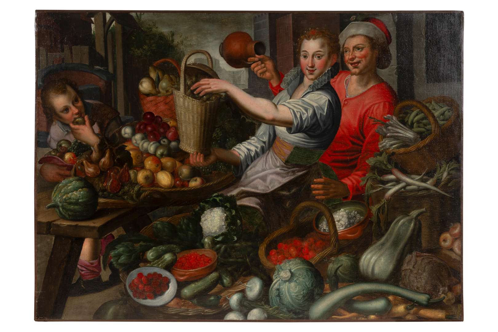 Conçue pour être présentée avec trois autres compositions, l’iconographie de cette scène de marché est liée à une série où la nourriture renvoie à chacun des quatre éléments : un intérieur de cuisine pour le feu, une scène de marché aux volailles pour l’air, aux poissons pour l’eau et aux légumes, pour la terre. Motifs empruntés aux répertoires de Pieter Aertsen (1508 - 1575) et Joachim Beuckelaer (c. 1533 - c. 1574) ceux-ci ont influencé nombre de peintres autour d’eux à l’instar de Jehan de Saive II (1571 - 1624) ou Jeremias van Winghe (1578 - 1645). Si les modèles originels ne sont pas connus, une série complète de Beuckelaer sur le thème est aujourd’hui conservée à la National Gallery de Londres (NG6585, NG6586, NG6587, NG6588).