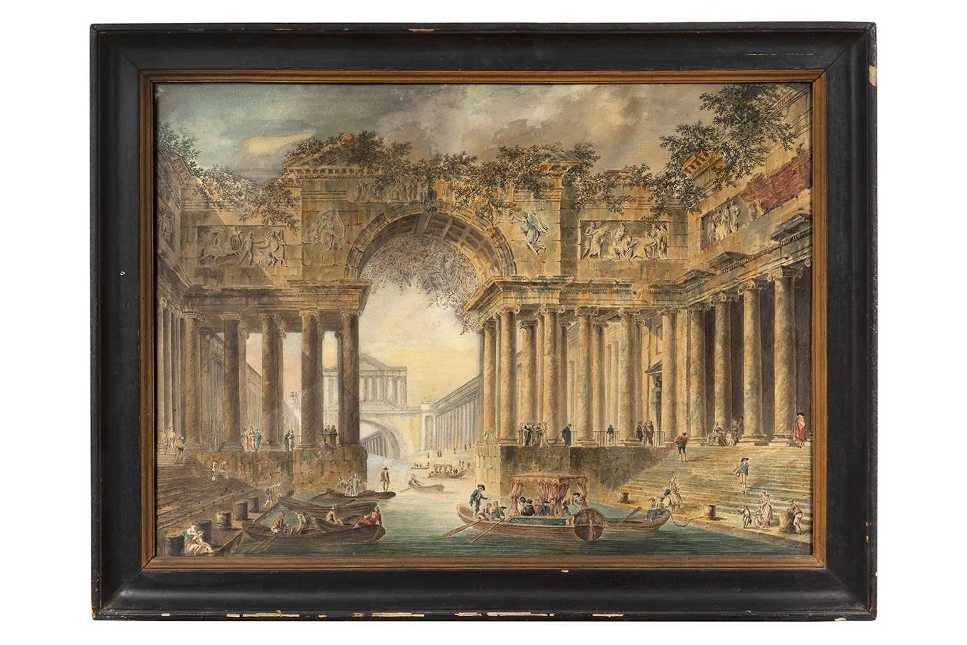 Animated architectural capriccio, watercolour, pen and brown ink