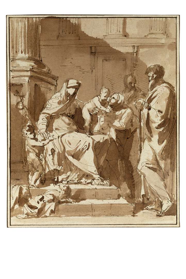 The Holy Family with Saint John the Baptist and three other saints, pen and brown ink, brown wash and black chalk