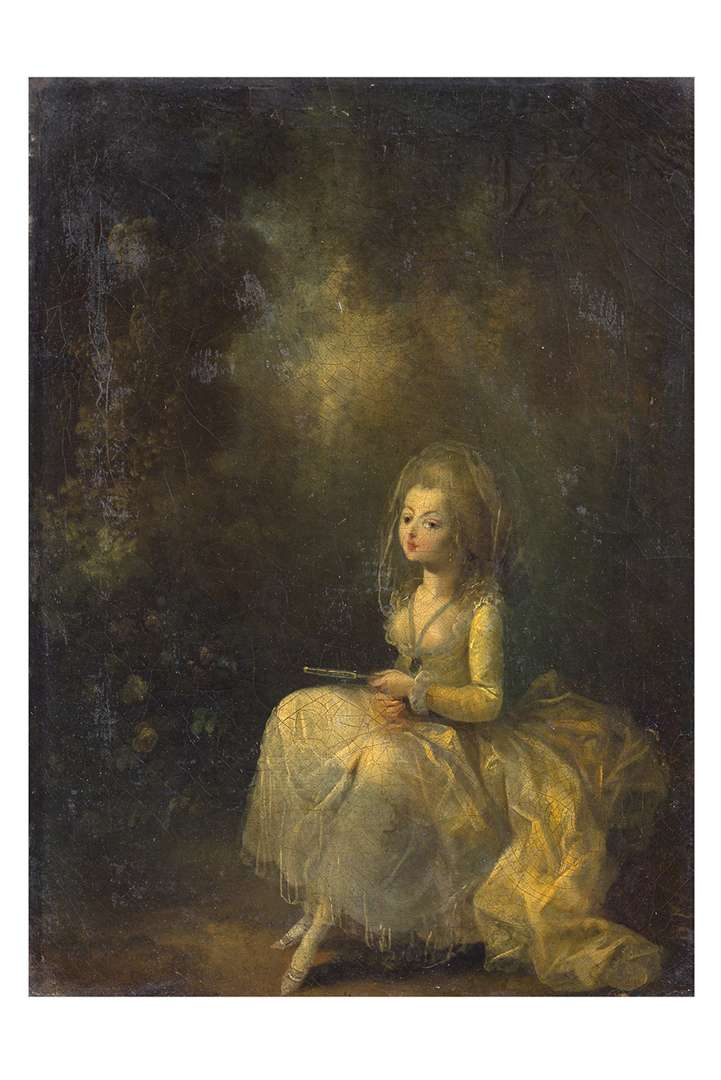 Reprenant la formule qu’il emploie pour certaines de ses danseuses, Schall place son jeune modèle sur un fond de frondaisons verdoyantes. Représentée assise, le regard tourné vers nous, la raison de sa présence est à deviner dans ses atours et son éventail qu’elle doit agiter avec frénésie. Cela trahissant son impatience, sa gorge découverte qu’un voile léger ne feint pas de dissimuler, ce refuge qu’elle a choisi à l’ombre des regards indiscrets, tout nous invite à l’imaginer bientôt en galante compagnie.