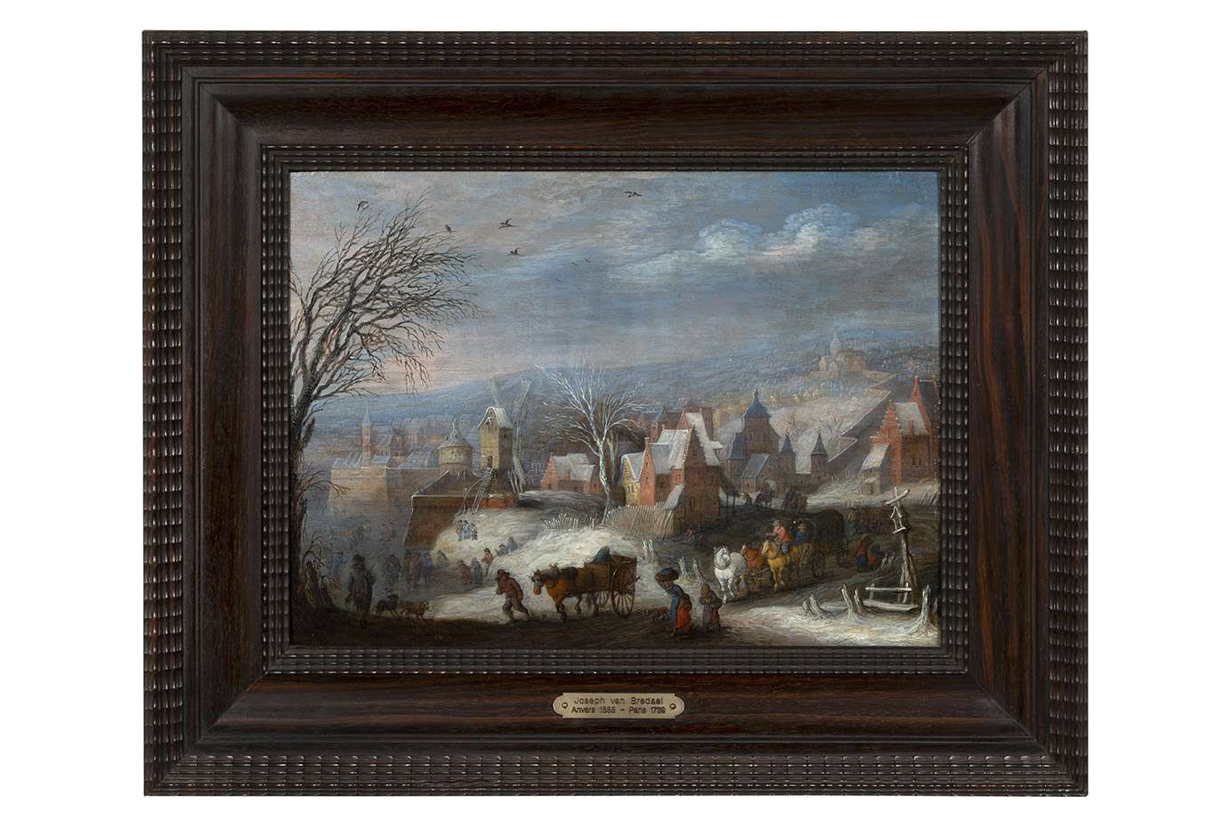 A winter landscape on the outskirts of a town, with figures skating on a frozen lake, oak panel