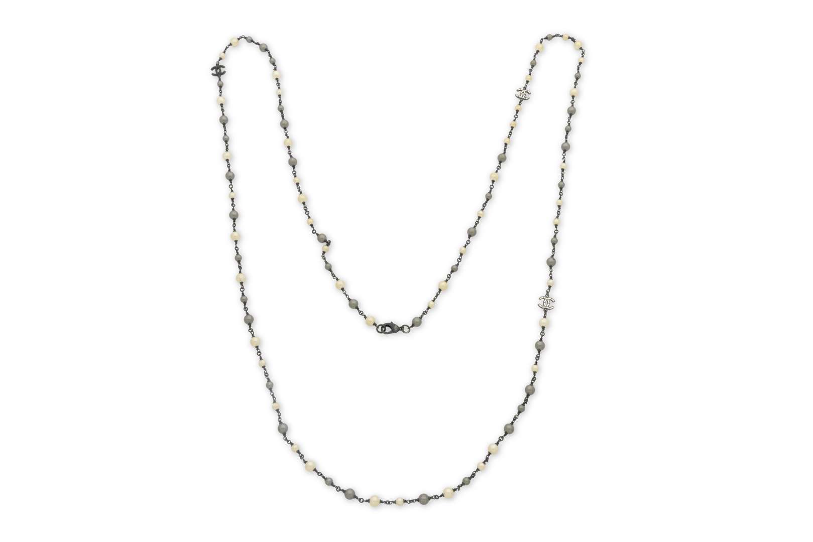 Collier en métal noirci finition queue-de-cochon retenant des perles fantaisies ivoire et grises et éléments siglés strassés