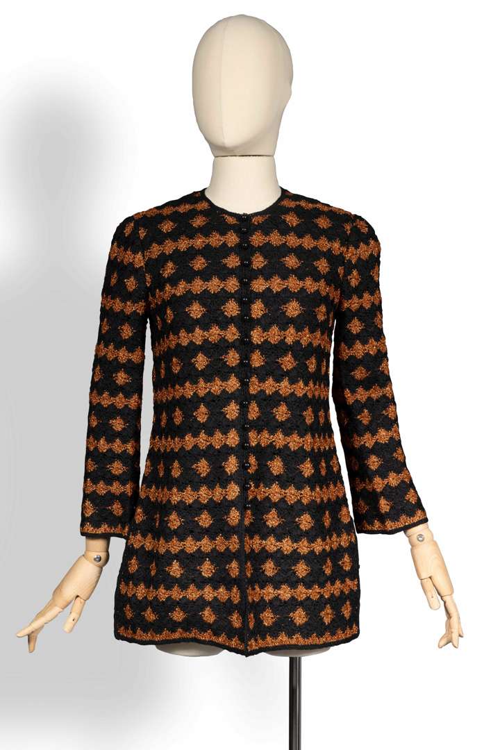 Veste cardigan en crochet noir et fil de lurex bronze à encolure arrondie, boutonnage rond en bakélite noir