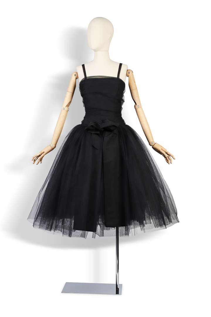 Robe de cocktail façon tutu de danseuse à bretelles en tulle noir orné à la taille d'un nœud, bustier intégré au corsage plissé, la jupe constituée de plusieurs épaisseurs en pareil, fermeture au dos par crochets et boutonnage pression