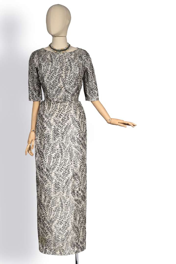 Ensemble du soir en faille de soie imprimée sur chaîne blanc et gris, comprenant une robe longue à bretelles, décoré d'un bouillonné ceinturant les hanches maintenu par des crochets au dos, et d’un boléro boutonné assorti