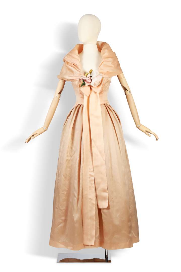 Robe de cocktail en organza satiné rose poudré à encolure drapée façon châle, bustier baleiné intégré au corsage à décolleté en V rehaussé d'une rose artificielle, la jupe ample doublée d'un jupon d'organza et de tulles dans les mêmes tons