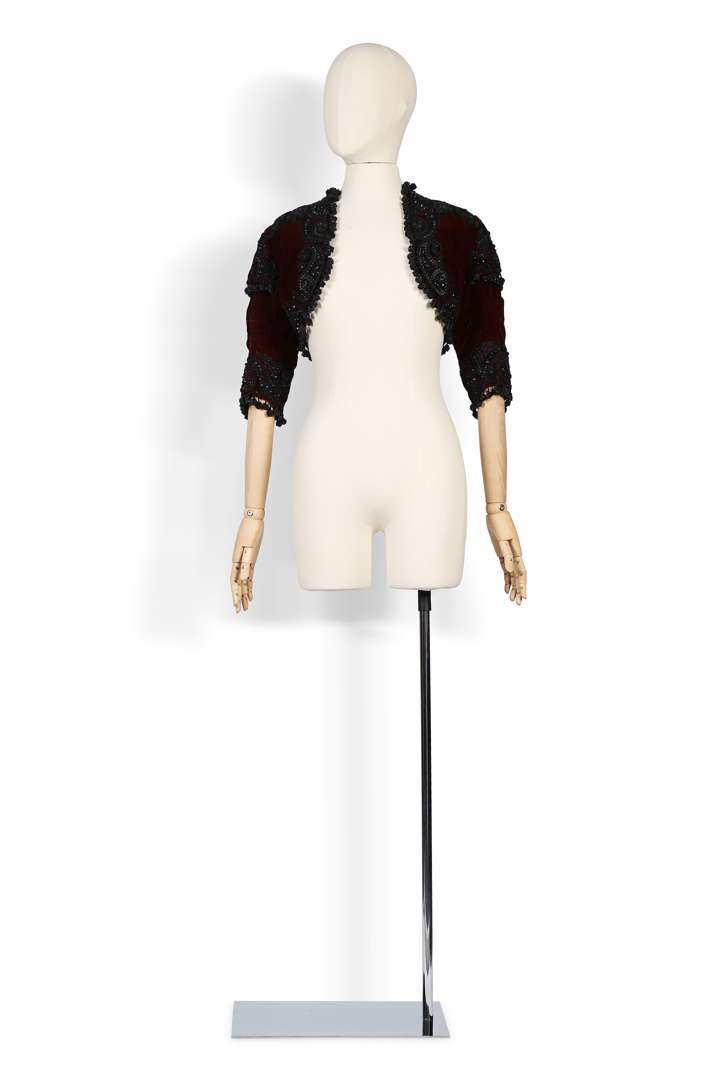 Boléro du soir en velours de soie bordeaux rehaussé de broderies de perles de jais, de passementeries noires et bordé de pompons, réalisées par le brodeur Bataille.