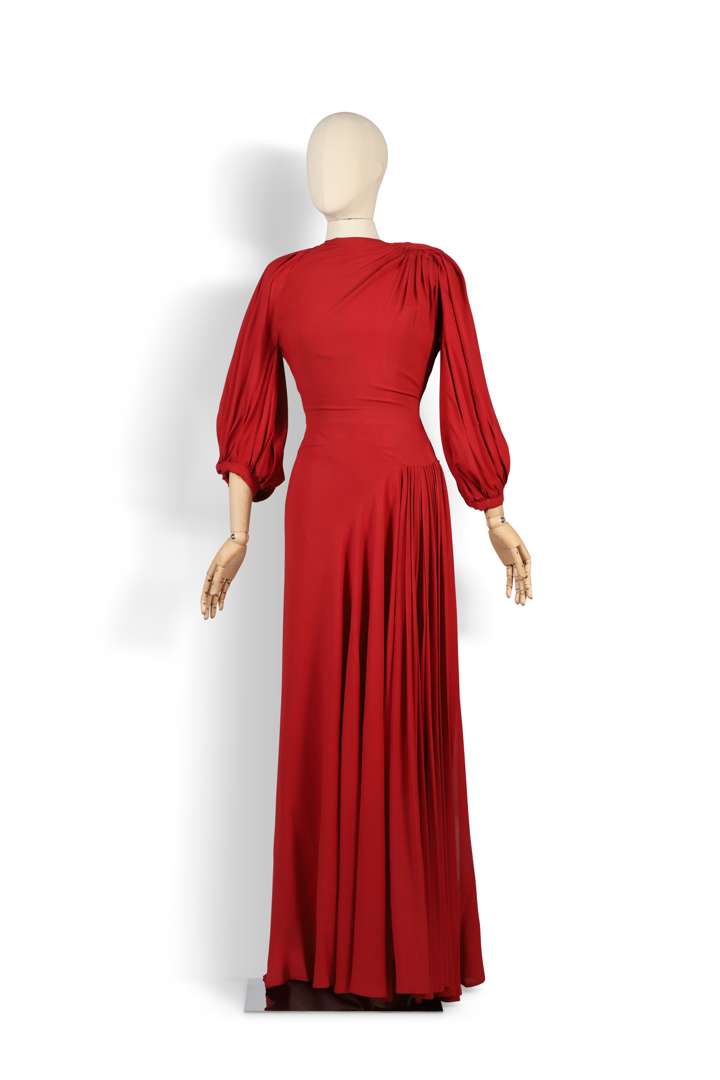 Robe du soir en crêpe de viscose rouge garance à manches ¾ bouffante, travail de plissé asymétrique aux épaules et sur un côté de la jupe ; avec un fond de robe intégrant des épaulettes