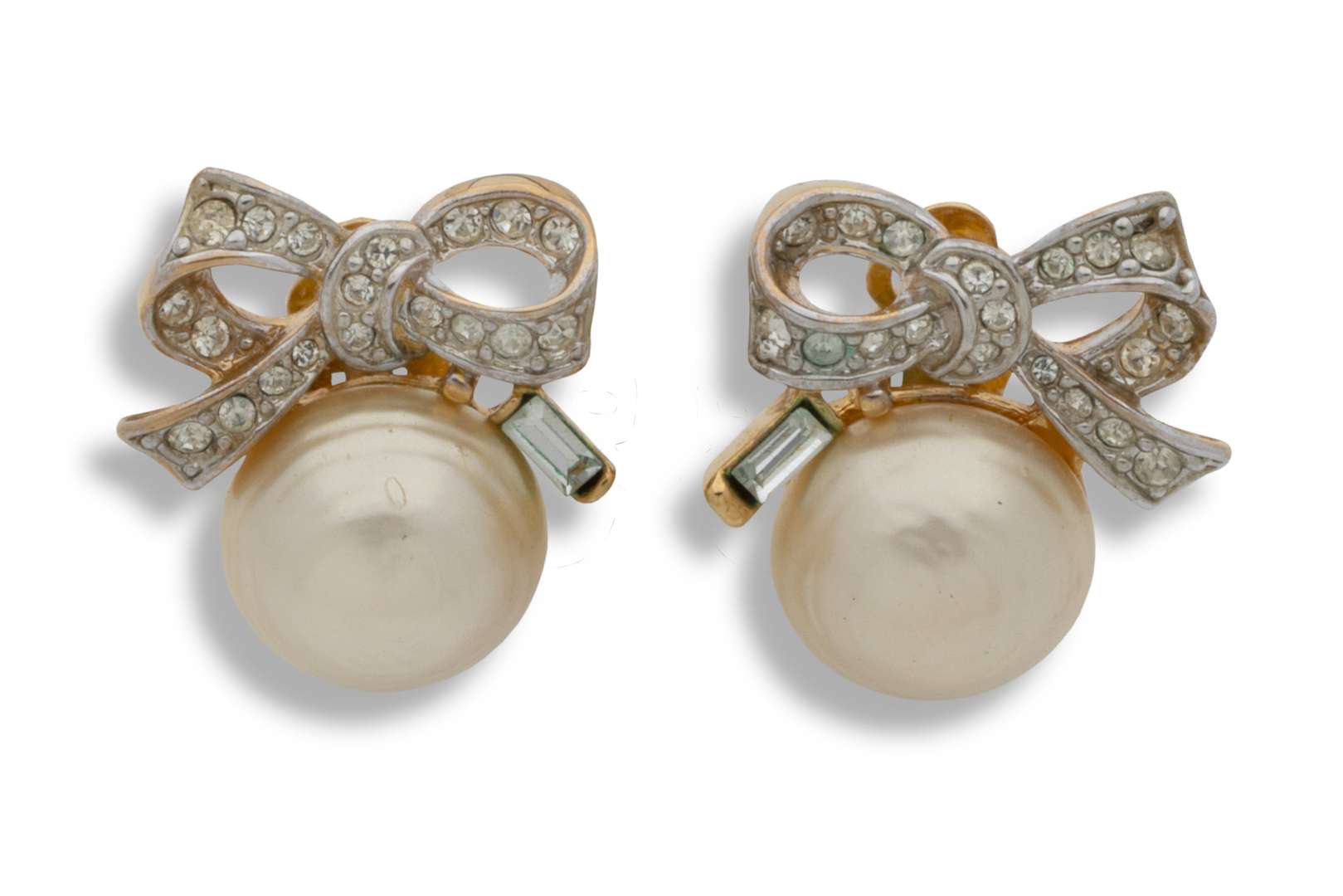 Paire de boucles d'oreilles à clip en métal doré incrusté de strass et retenant une perle fantaisie nacrée