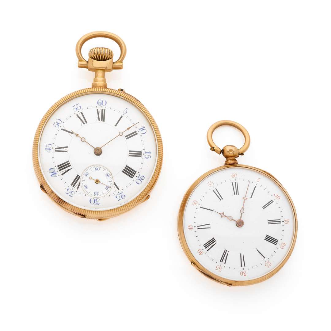 Ensemble de deux montres de poche en or, l’une et l’autre avec cadran émail blanc, chiffres romains pour les heures et rands pour les minutes, les mouvements avec un remontage à clef et échappement à cylindre pour l’un et remontage à couronne avec échappement à ancre pour l’autre.
