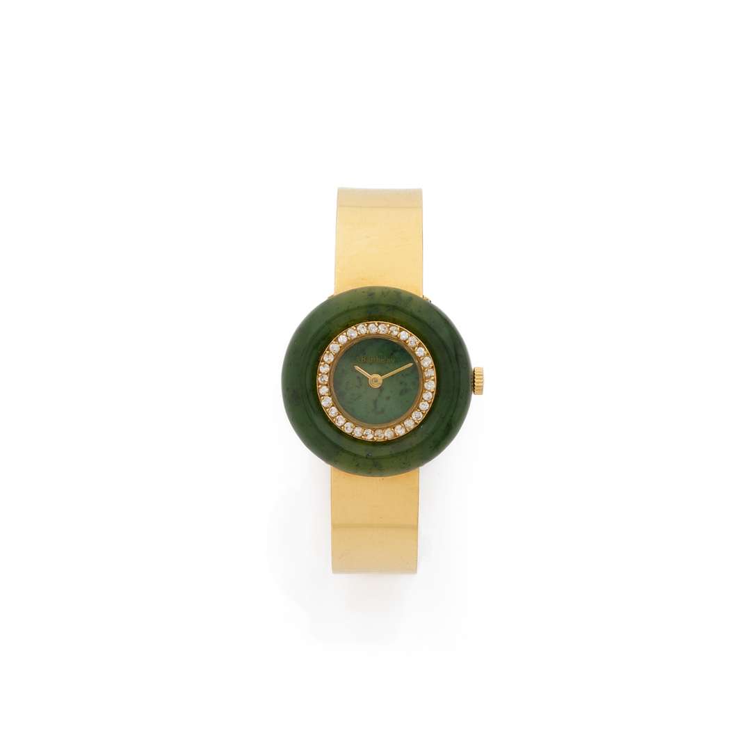 Boîtier : en néphrite et or jaune 18k (750), lunette sertie de diamants, couronne cannelée, fond clipsé, signé
