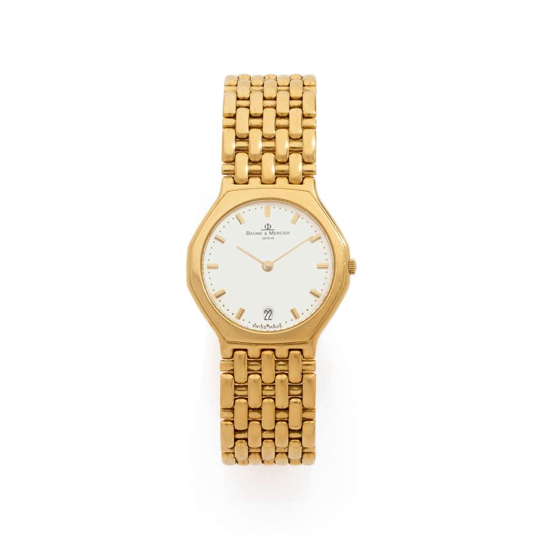 Cadran : blanc, index appliqués, minuterie perlées, aiguilles dorées, guichet date à 6h, signé