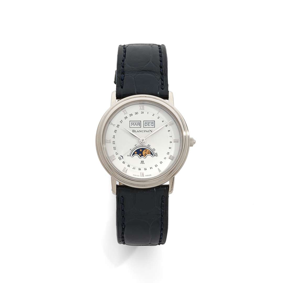 Cadran : blanc, index appliqués, date et logo “JB 1735” peinte sur le cadran, aiguilles feuilles grises, aiguille chemin de fer pour la date, guichets jour de la semaine et mois à 12h, phases et âges de la lune à 6h, signé