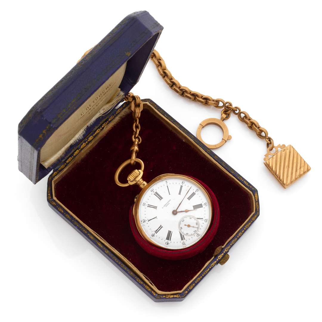 Cadran : émail blanc avec chiffres romains pour les heures et arabes pour les minutes, minuterie externe, petite trotteuse, signé