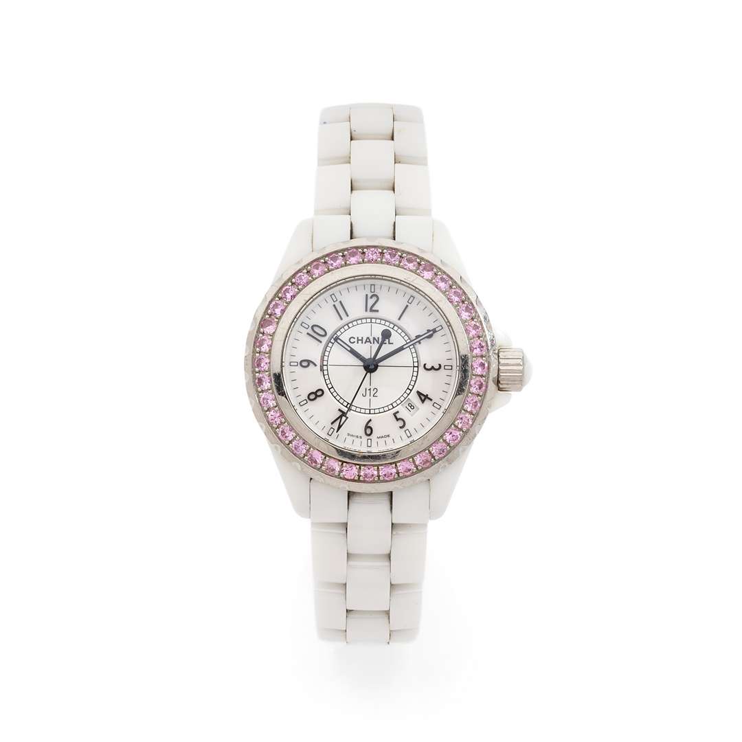 Montre bracelet de dame en céramique blanche et saphirs roses