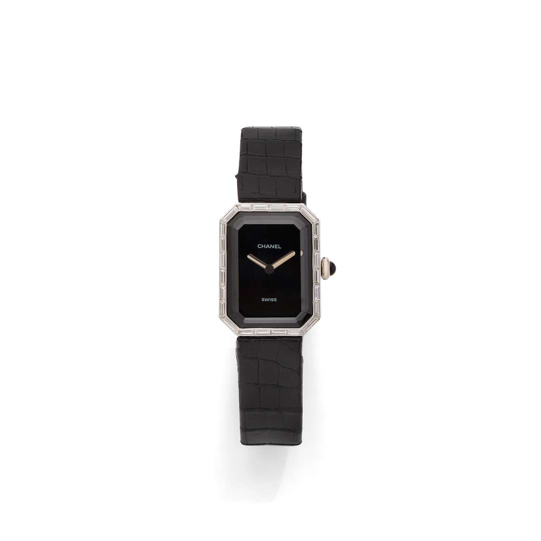 Boîtier : octogonal, lunette sertie de diamants taille baguette, couronne ronde, fond clipsé, signé