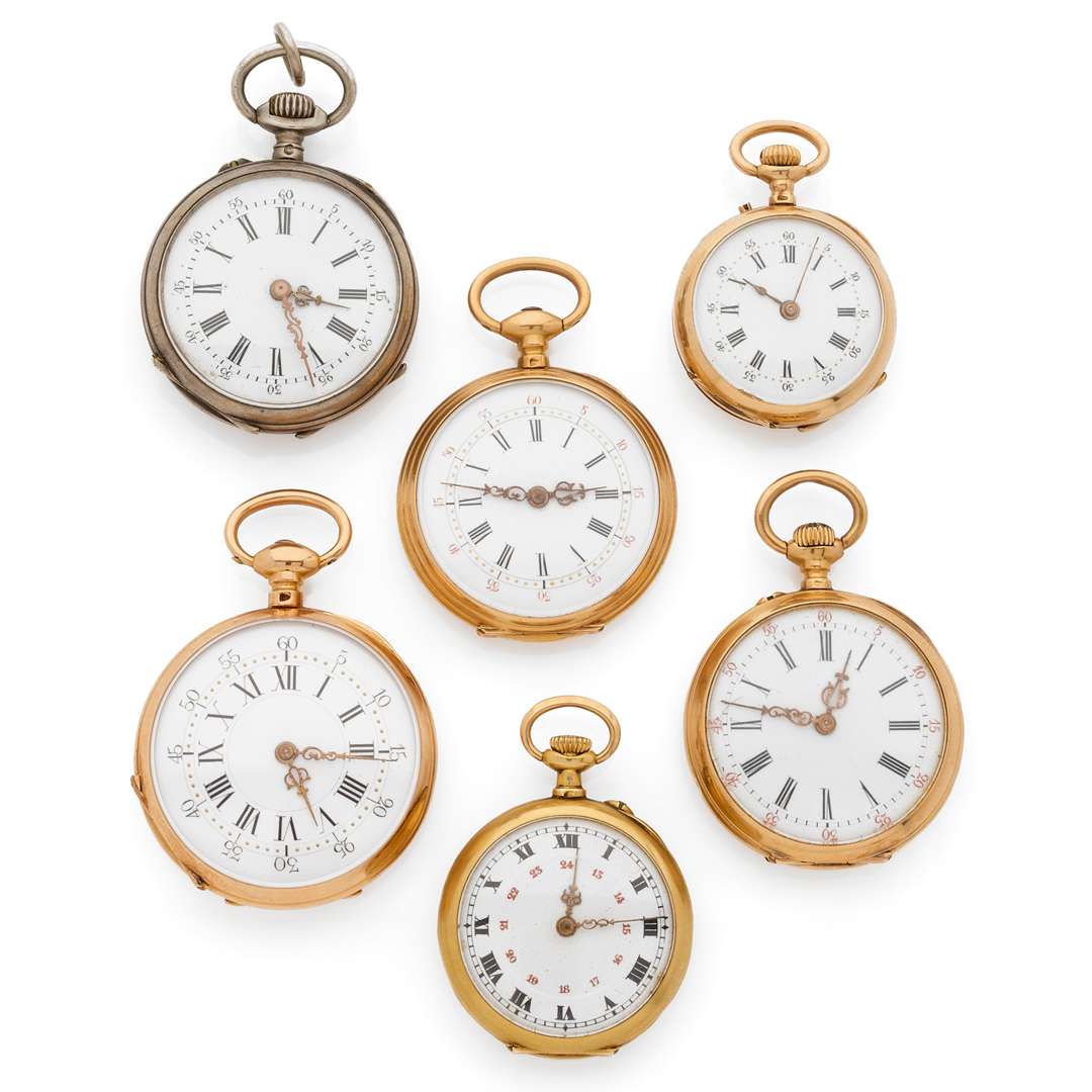 Ensemble de six montres de col, cinq en or et une en argent, l’une et l’autre avec cadran émail blanc, chiffres romains pour les heures et arabes pour les minutes, les mouvements avec un remontage à clef ou à couronne.