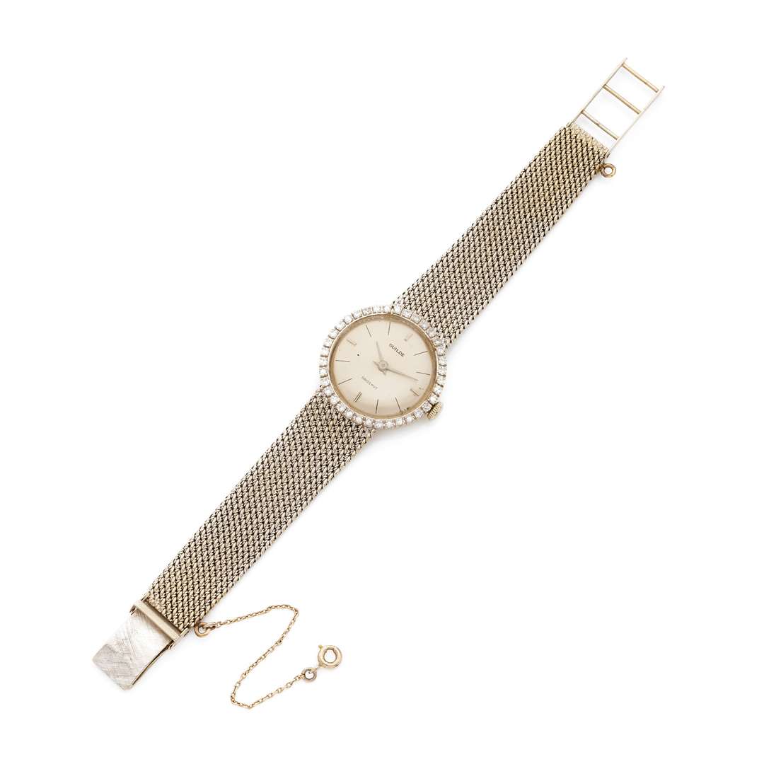 Boîtier : rond, lunette sertie de diamants, couronne cannelée, fond clipsé