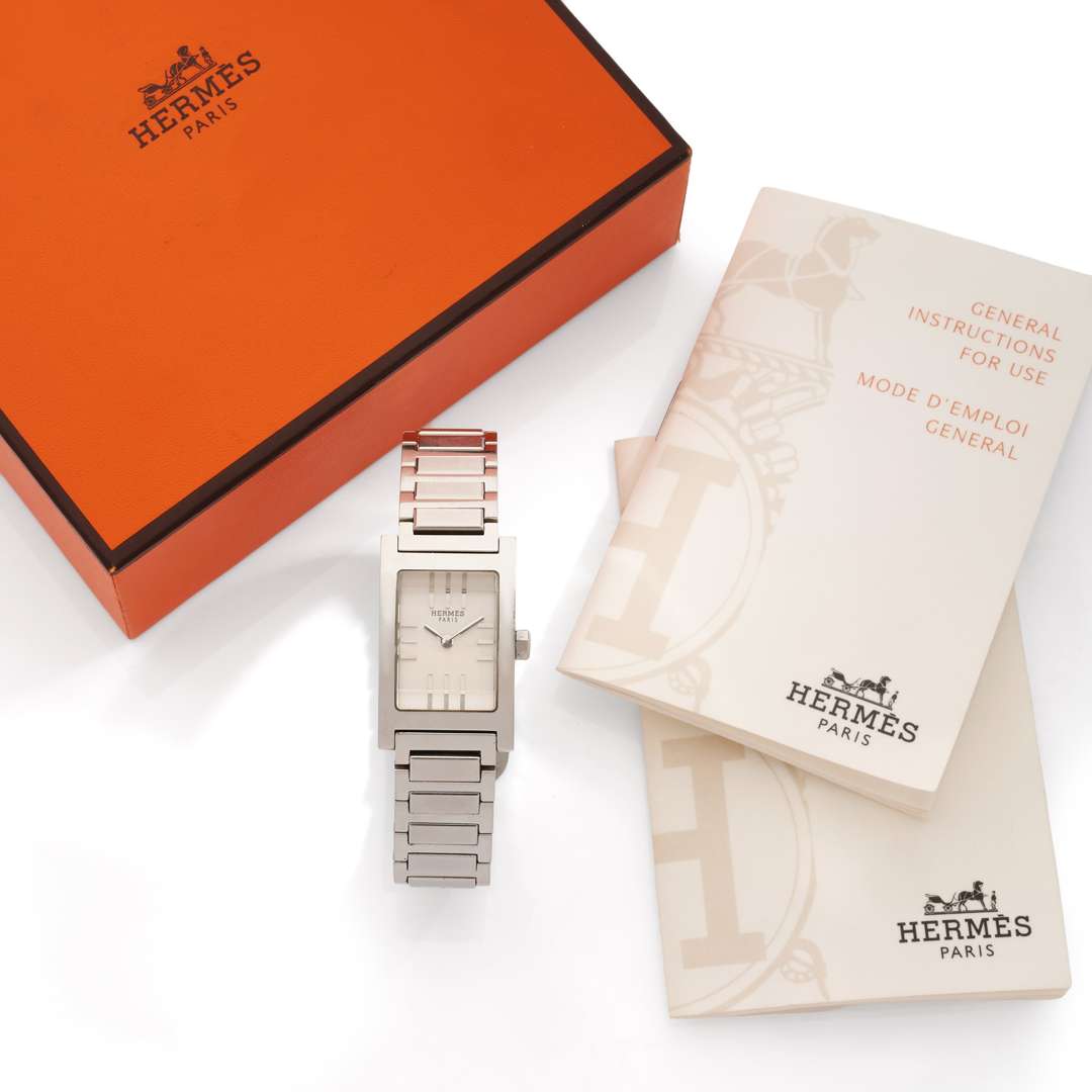 Cadran : gris, index bâtons appliqués, aiguilles grises, signé