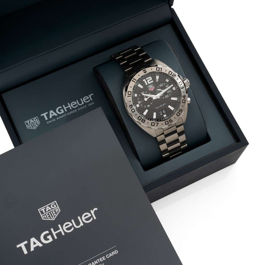 Cadran : noir, index appliqués, minuterie peinte, aiguilles grises luminescentes, deux sous-compteurs, l’un pour les secondes et l’autre pour la fonction alarme, double guichet date à 6h, signé