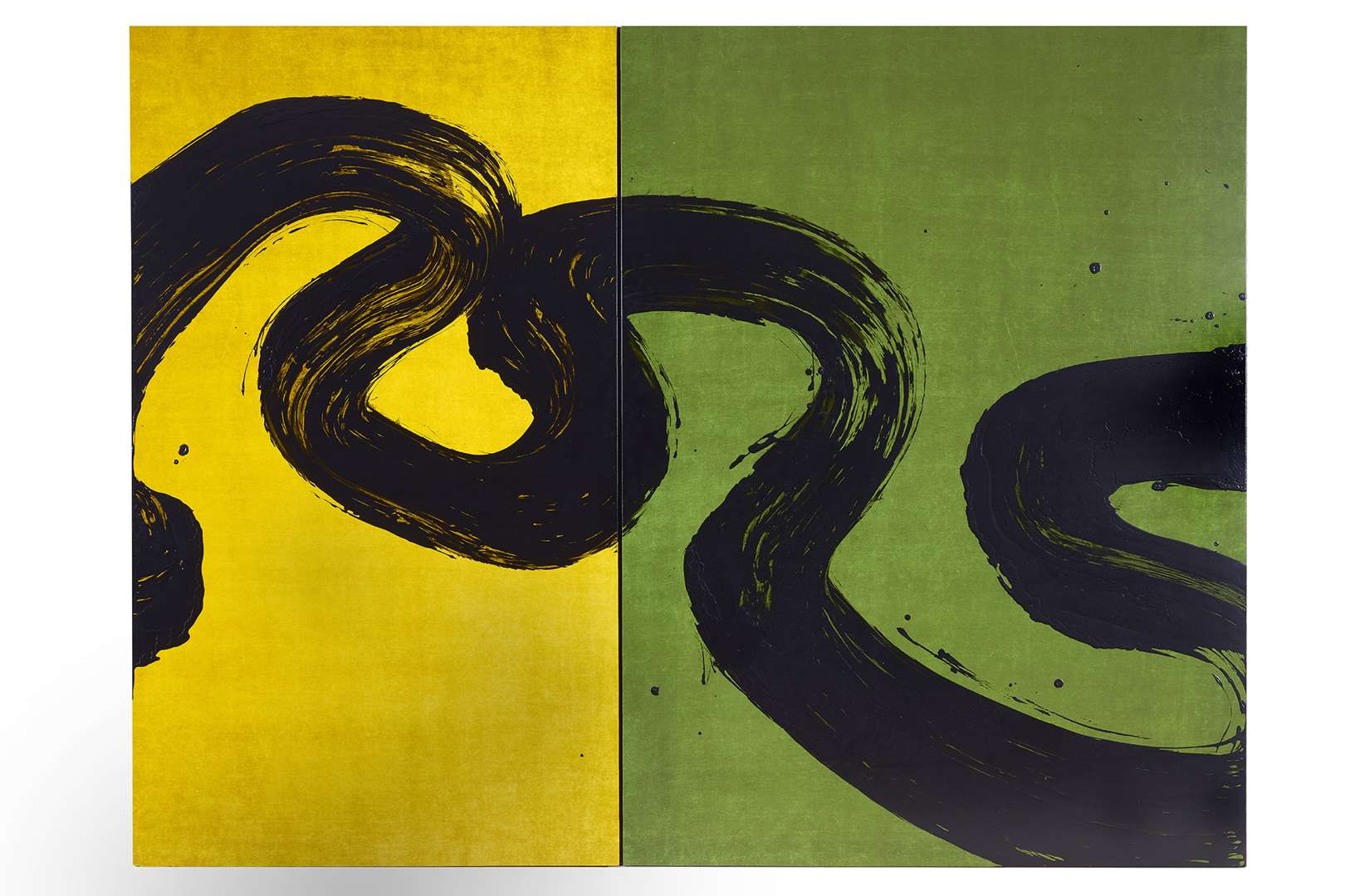 Ink, pigments and varnish on canvas mounted on panel, signed, titled, located and dated L’Atelier, Autumn 2011; horizontal bichrome diptych in yellow and green