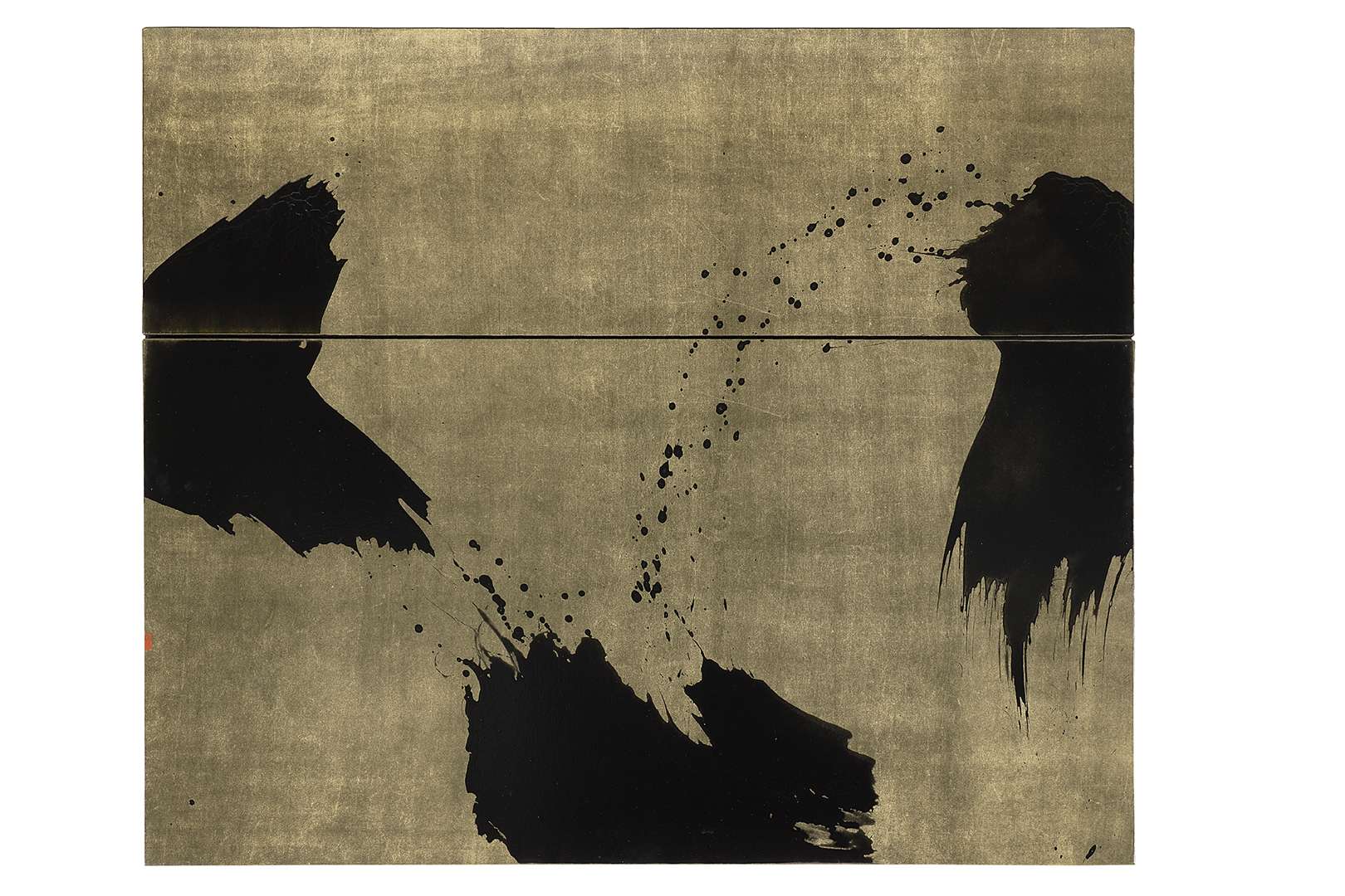 Oil and ink on linen-cotton canvas mounted on panel, signed, titled, dated and inscribed L'ermitage Autumn 2004, annotated Xin Heart Spirit Intuitive Grey Monochrome on the reverse| vertical monochrome diptych