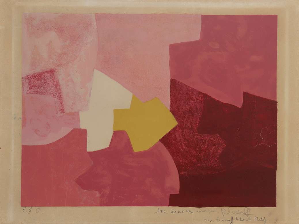 Lithographie couleurs, annotée e.d.a. en bas à gauche, signée au crayon en bas à droite et dédicacée "Avec tous nos vœux. Serge Poliakoff et Marcelle Poliakoff" dans la marge en bas à droite