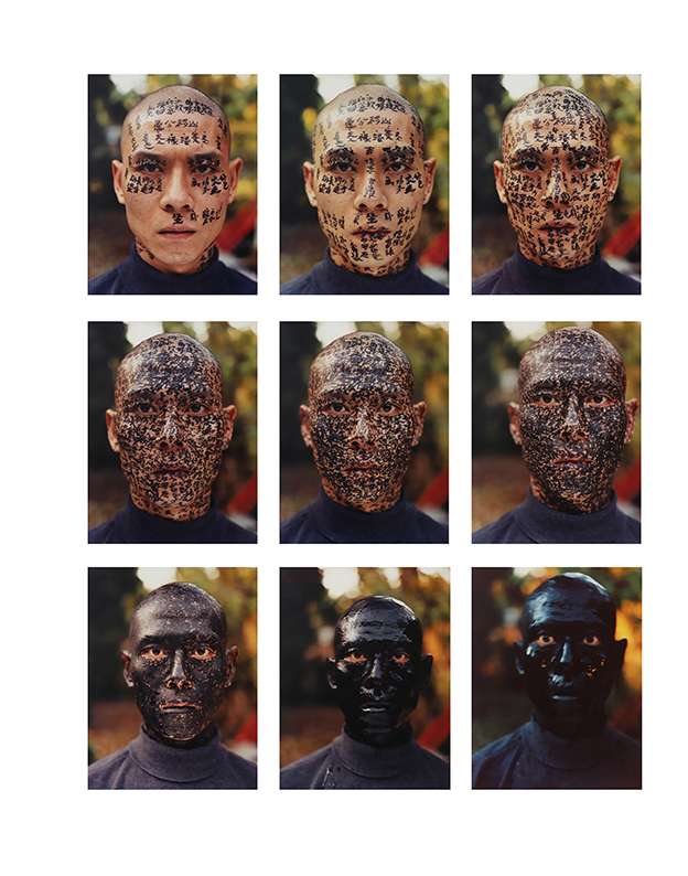 Réalisée moins de deux ans après son installation à New York, la série Family Tree marque un tournant dans la pratique de Zhang Huan. L’artiste y utilise son propre visage comme support, sur lequel sont inscrits des mots, noms et récits en lien avec son héritage culturel. À travers neuf photographies successives, le visage de Zhang se couvre peu à peu d’encre jusqu’à être entièrement noirci. Inspirée de la physiognomonie chinoise, cet art ancien visant à lire le caractère et le destin à partir des traits du visage. L'oeuvre interroge la manière dont les traditions et la culture façonnent, voire masquent, l’identité individuelle. Puissante et introspective, Family Tree illustre avec force la tension entre mémoire, appartenance et effacement de soi.