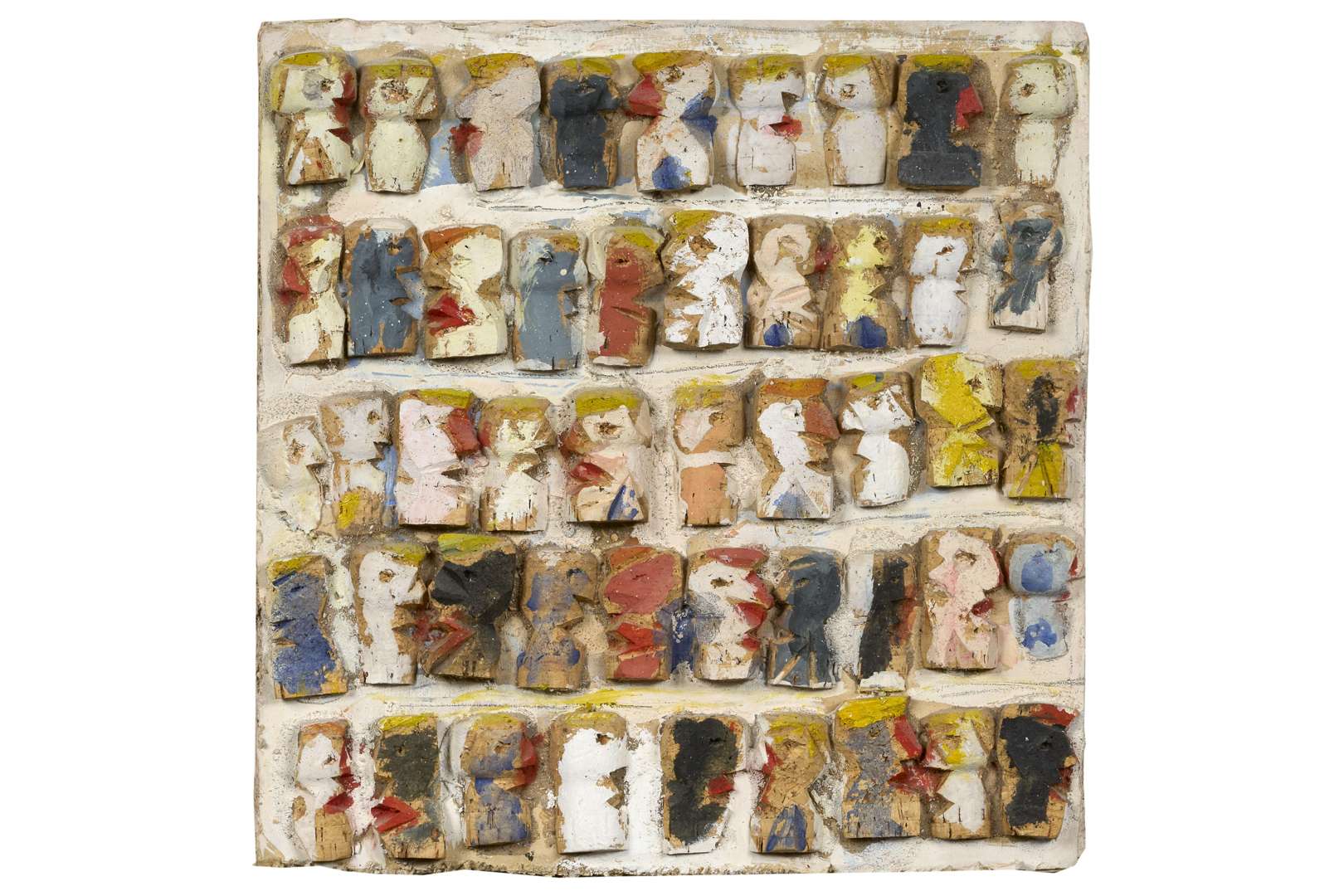 Assemblage of cut and painted cork on cardboard mounted on a wooden panel, inscribed, titled, signed and dated on the reverse