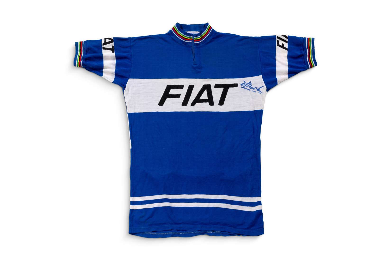 Maillot Replica FIAT avec liserés de champion du monde signé par le coureur. Maillot jaune protocolaire signé par le coureur espagnol sur le Tour de France 2009. Certificat d'authenticité (COA) sur demande.