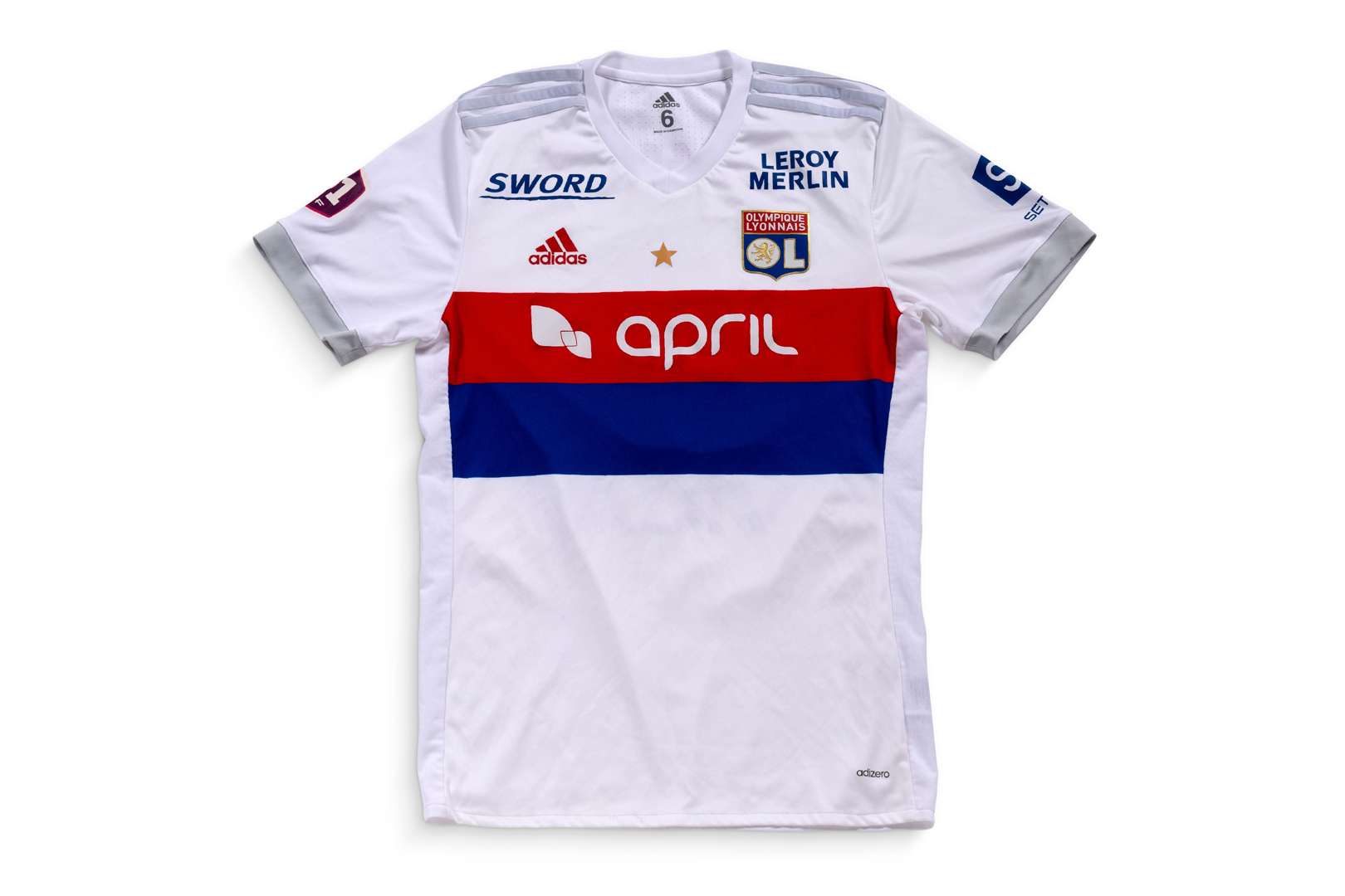 Maillot n°6 de l'Olympique Lyonnais préparé pour la saison 2017-2018 de D1 Féminines. Match à déterminer. La joueuse joue 7 matchs. Marque Adidas. Modèle Adizero. Taille 6. Fabriqué en Cambodge.