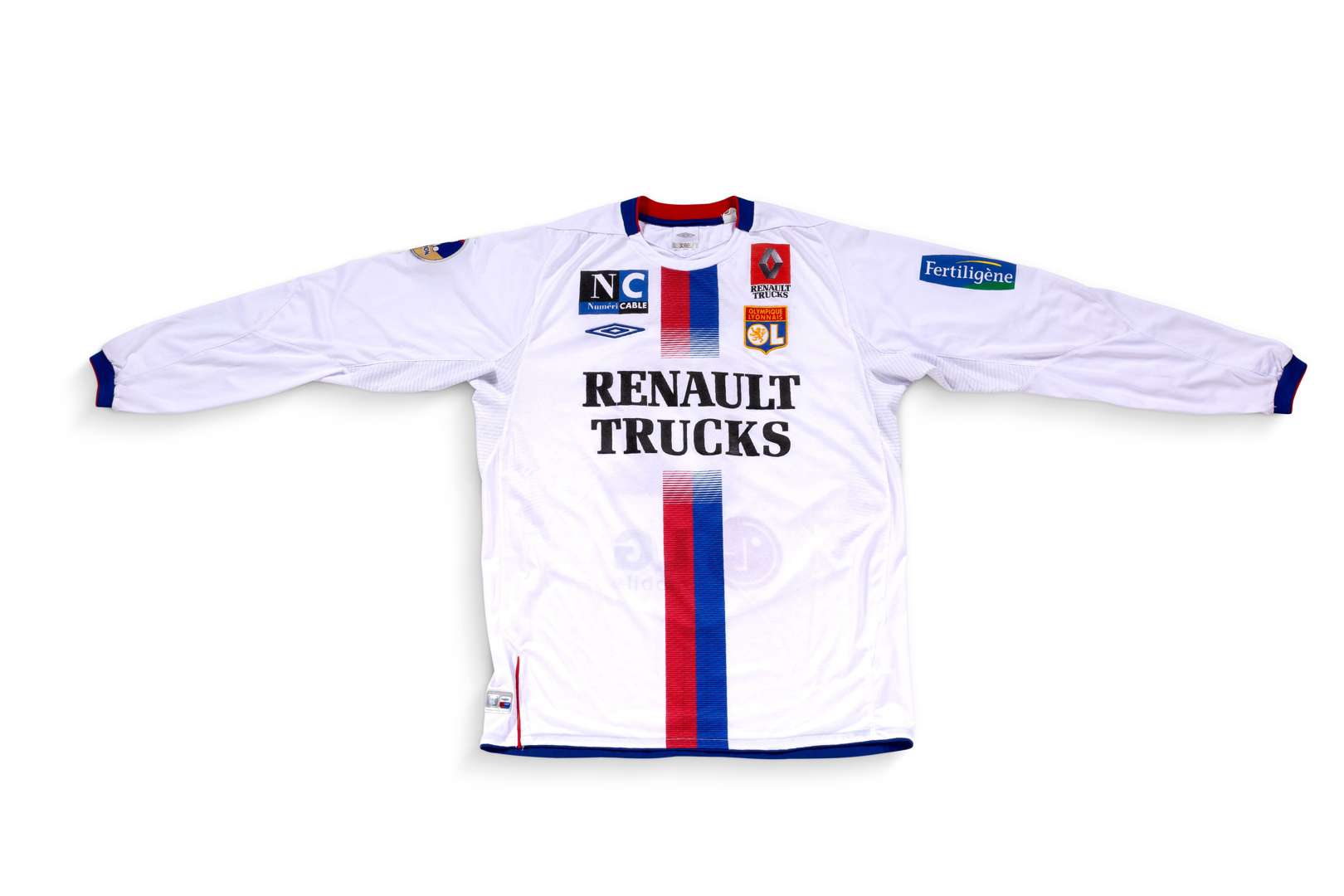 Maillot n°12 de l'Olympique Lyonnais préparé pour la saison 2004-2005 du championnat de France de Ligue 1. Match à déterminer. Le joueur joue 33 matchs. Marque Umbro. Modèle X Static. Taille L. Fabriqué en Chine.