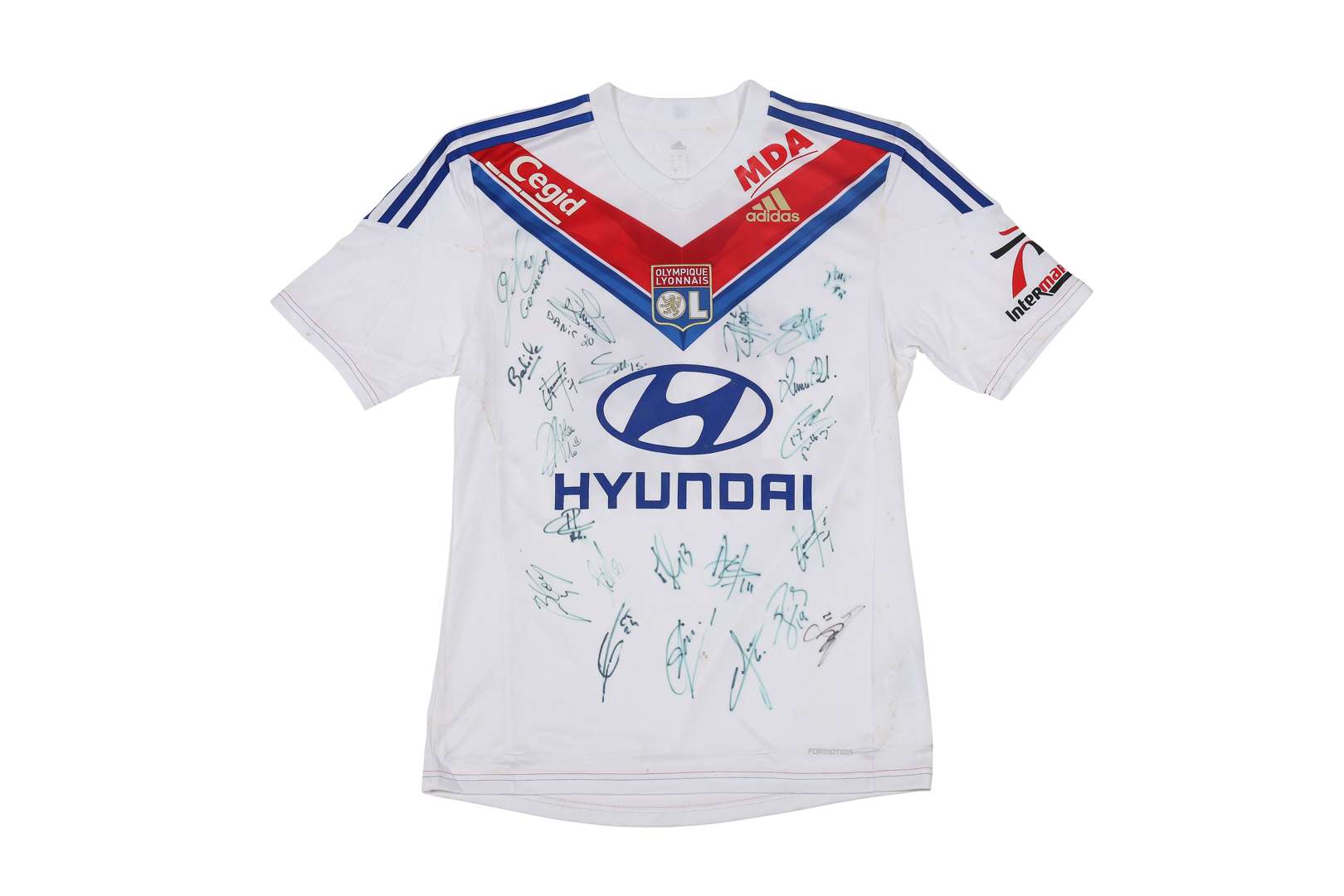 Maillot n°18 de l'Olympique Lyonnais, saison 2013-14 signé par une vingtaine de joueurs de l'effectif. Marque Adidas.