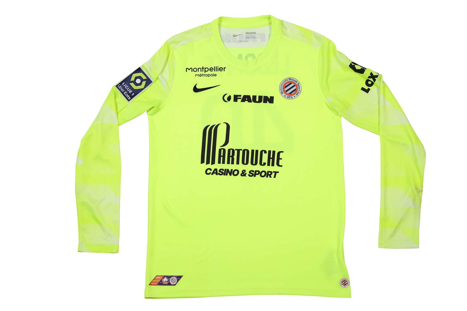 Maillot n°40 du Montpellier Hérault T porté lors de la 35ème journée du championnat de France de Ligue 1 face au Amiens SC le 5 mai 2019. Le joueur joue 90 minutes. Marque Nike. Fabriqué en Indonésie. Taille M. Certificat d'authenticité (COA) sur demande.