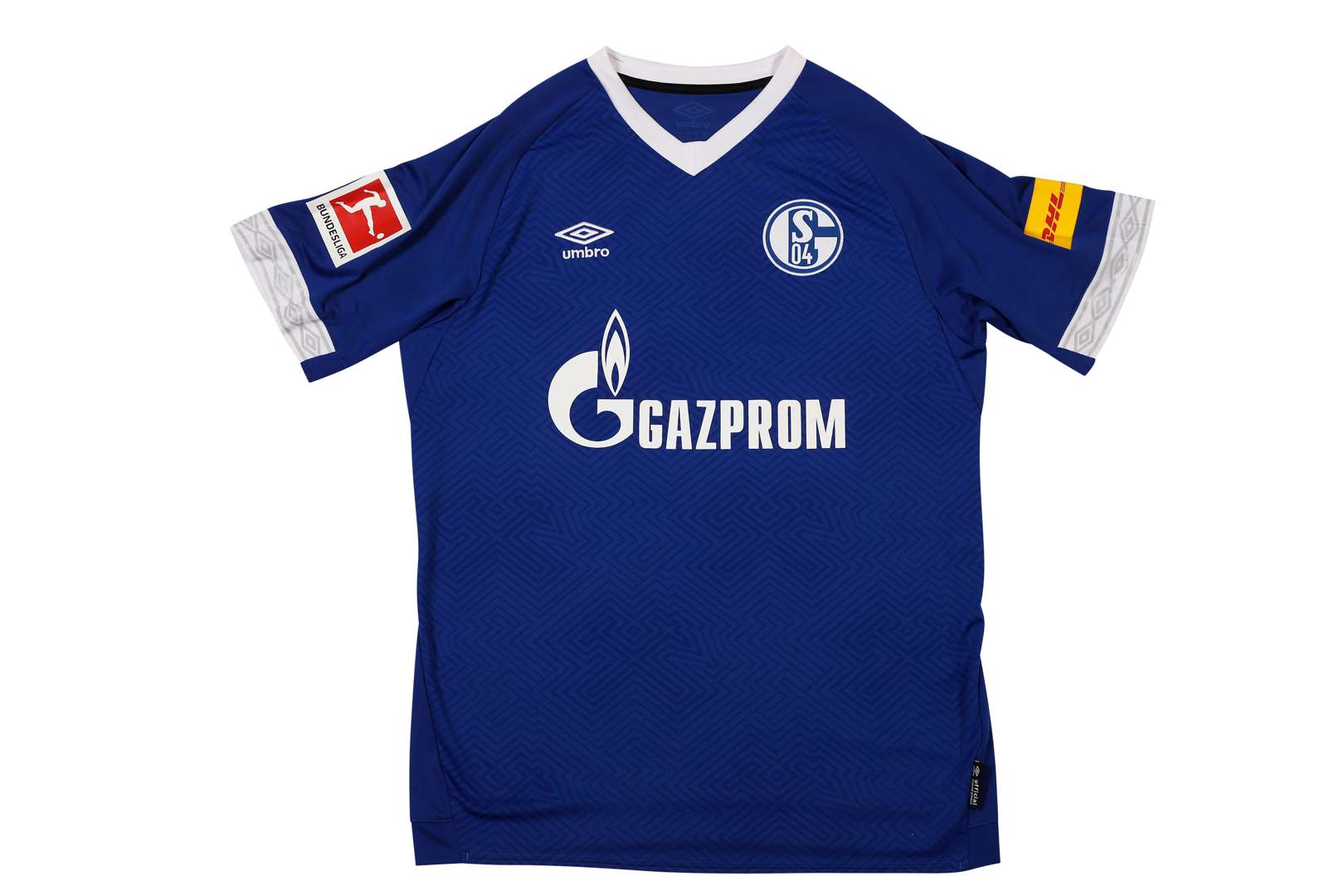Maillot n°40 de SCHALKE 04 porté lors du championnat d'Allemagne Bundesliga saison 2018-2019. Le joueur joue 21 matchs; Match à déterminer. Marque Umbro. Taille L.