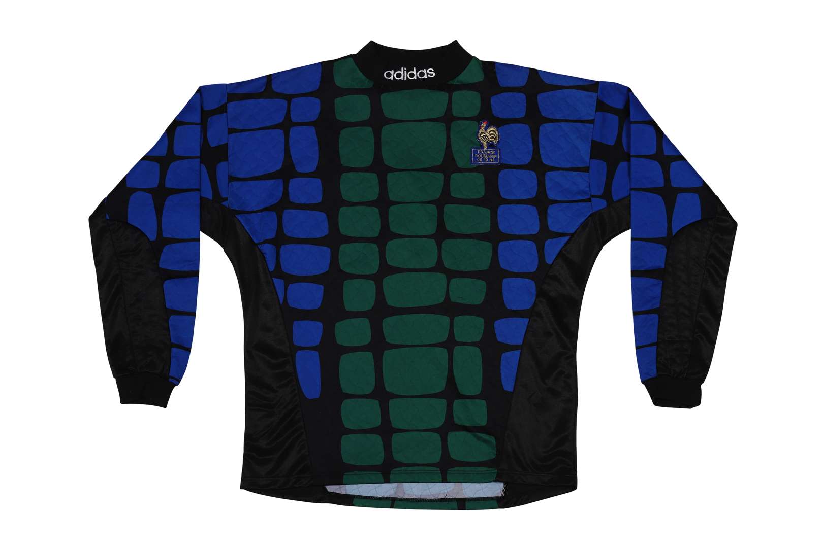 Maillot n°1 de l'équipe de France porté lors de la rencontre des éliminatoires de l'Euro France - Roumanie le 8 octobre 1994 (0-0). Maillot Adidas. Taille XL. Fabriqué au Royaume-Uni.
